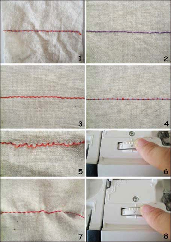 4)、缝料皱缩:面、底线张力都过大,两线的交合点处于缝料之间,但缝料产生皱缩(特别是薄料)和不平直,稍微用力一拉缝料,就会使缝线拉断。解决方法:减小面线、底线的张力即可。(如图7、8)